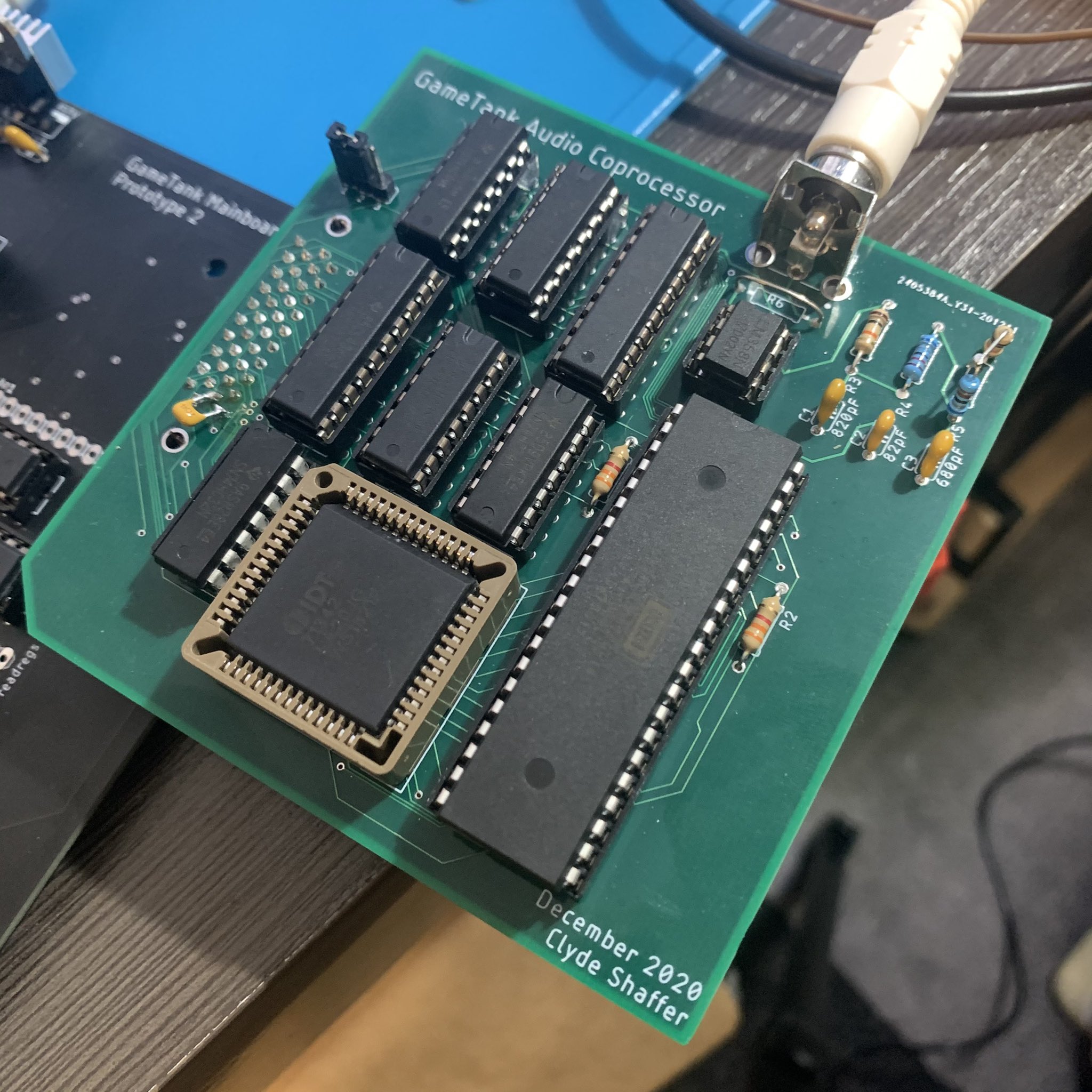The jumper in the picture is for switching the coprocessor's clock between 3.5MHz and 7MHz. The system's main CPU runs at 3.5MHz due to the rather loose timing of the address decoding and the devices hanging off of the bus. I figured that the Audio Coprocessor could run a bit faster due to its simplicity, but I hadn't realized that it would even run fine at 14MHz. Not pictured is the bodge wire I added to let the audio system run at 14MHz, giving ample headroom for more complex audio synthesis routines.